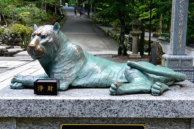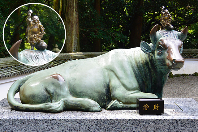 本堂の前にある、狛犬ならぬ大黒様が乗っている牛と寅の像・智慧寅。